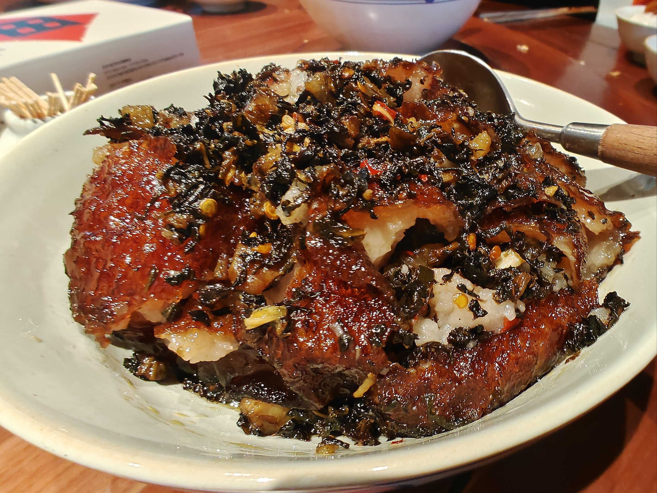這倆燒白,咸的皮焦肉酥,芽菜吸飽油香,咬一口“巴適得板”;