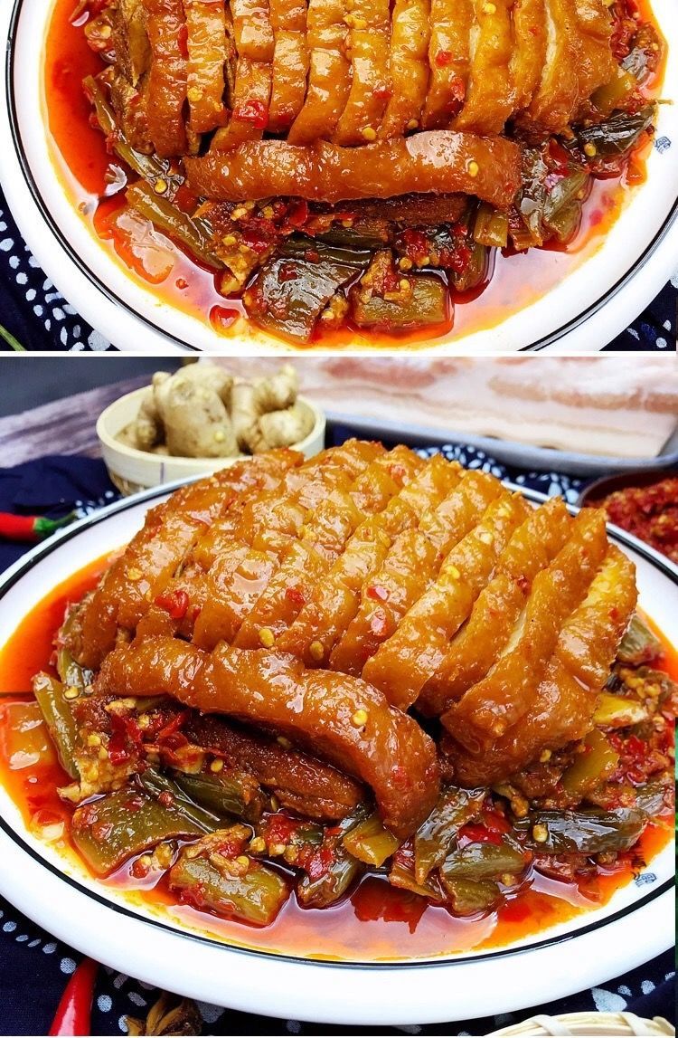 起鍋時(shí)倒扣盤(pán)里,肉皮彈牙似果凍,肥肉透亮不膩,菜干吸飽肉汁,