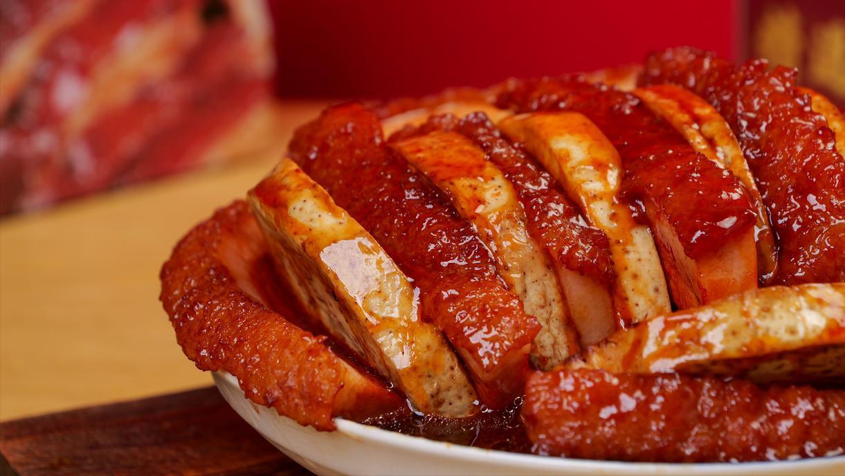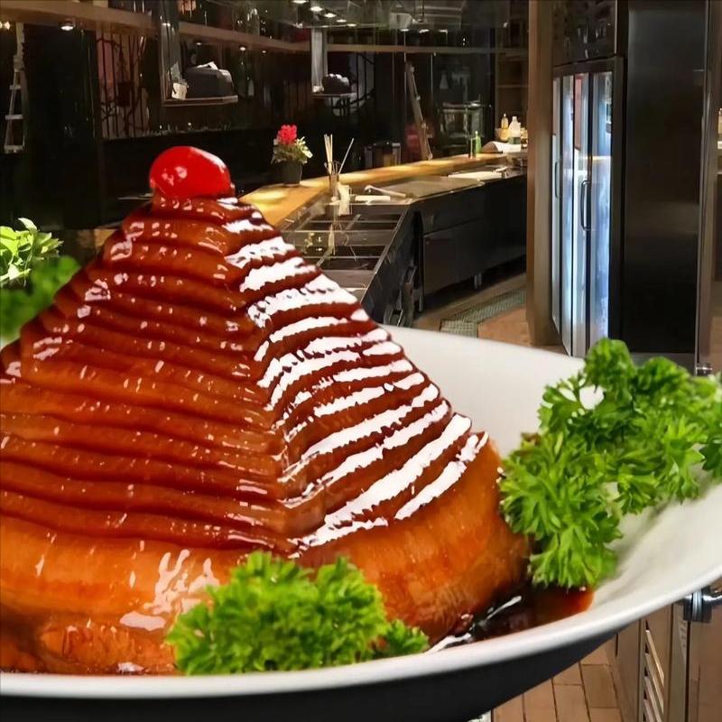 這肉講究“扣得方正、蒸得酥爛”,帶皮五花肉切寸厚,抹老抽炸至虎皮皺,梅干菜泡軟炒香墊底,肉皮朝下碼碗,蒸兩小時(shí)倒扣成盤(pán),油亮紅潤(rùn)如“紅袍”。