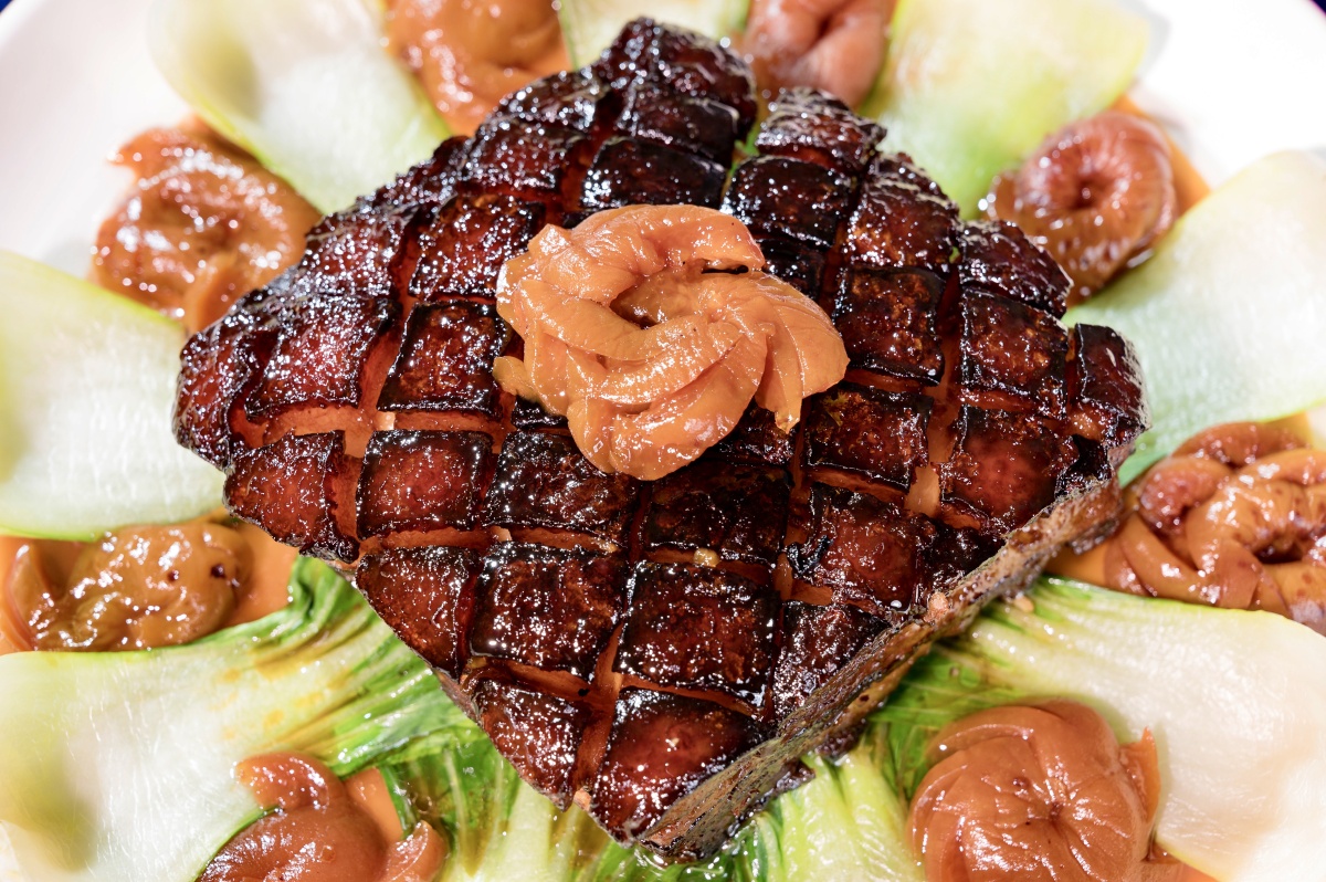 這肉講究刀工如繡,需將五花肉切出薄而不斷的連刀片,卷回塔形蒸透,澆上金醬后色澤油亮如琥珀,入口即化不膩,梅干菜香滲肉間,咸鮮回甘。
