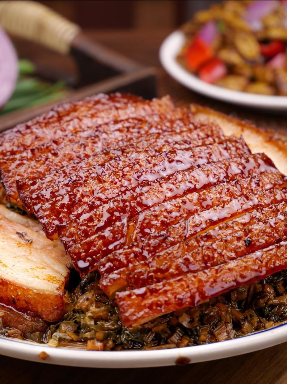 五花肉先煮至七分熟,皮上抹蜂蜜炸至金黃,再與泡發(fā)的梅干菜層層疊碼,加姜酒糖調(diào)味,慢蒸兩小時(shí)。