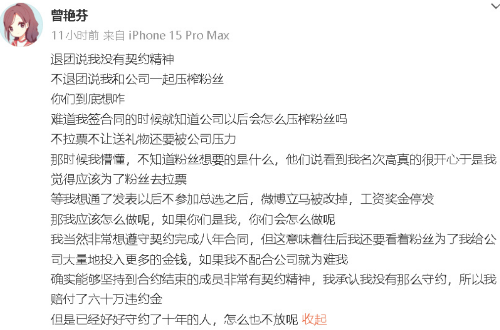搜狐娛樂(lè)訊 12月18日,在絲芭傳媒曬出報(bào)警回執(zhí)后,前成員曾艷芬再發(fā)文,透露自己之前宣布不參加總選后就被停發(fā)工資獎(jiǎng)金了,還透露自己賠付了60萬(wàn)違約金,此外還為鞠婧祎喊話絲芭傳媒:“已經(jīng)好好守約了十年的人,怎么也不放呢?”