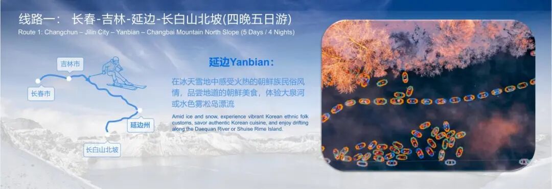 吉林省延邊州以新雪季文旅推廣為契機,主打“最美雪花+最暖冬季”兩大主題方向,通過黃金粉雪、霧凇漂流、雪地溫泉等優質冰雪資源吸引游客。作為我國唯一朝鮮族自治州,這里民俗風情獨特,象帽舞、延吉旅拍、非遺泡菜制作等體驗鮮活,冷面、延邊燒烤、帝王蟹等美食享譽全國,盡顯邊境風情與山海饋贈。
