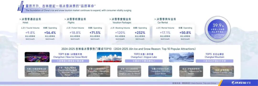 攜程集團在現場發布《2025吉林省冰雪季旅游數據洞察》,基于攜程數據解析吉林省冰雪旅游核心發展態勢與趨勢。當前全國冰雪旅游市場持續擴容,憑借世界級資源,吉林省穩居國內頭部冰雪目的地,并在攜程口碑榜·2026年度榜單中的滑雪景點榜、滑雪酒店榜、溫泉酒店榜排名前列,滑雪酒店榜單更是包攬全國前三。吉林省的國內客源呈現“南客北上”、年輕群體主導、深度體驗需求凸顯的特征;同時,吉林省的入境游表現尤為亮眼,上一冰雪季人次與消費額分別同比增長43%和36%,東南亞為核心海外客源市場,吉林省正穩步夯實東亞冰雪樞紐地位。整體來看,吉林冰雪旅游已實現從區域資源優勢向“量質齊升”的產業升級,未來攜程集團將持續深化與吉林全省的合作,助力其邁向冰雪產業的全球性新高度。