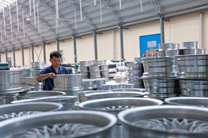 7月10日,工人在山東省聊城市茌平區(qū)一家鋁制品有限公司車間內(nèi)搬運(yùn)汽車零部件。(新華社)
