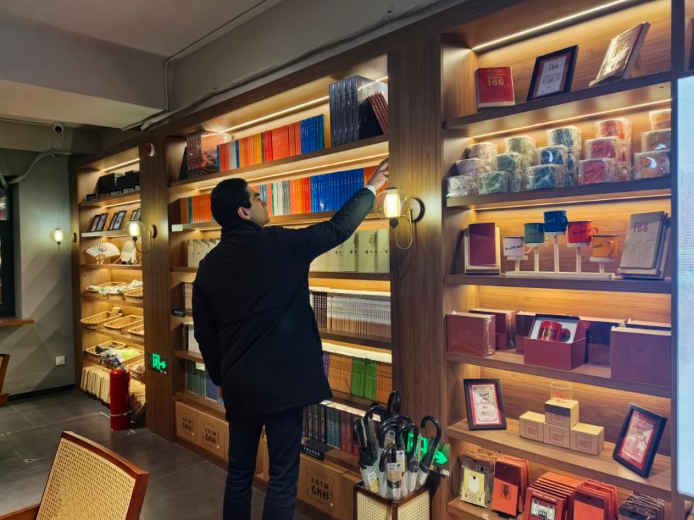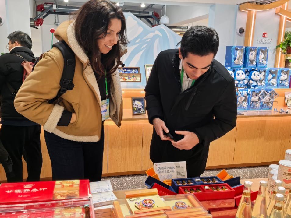 采風團走進春京西歷史文化街區,作為長春市首個建成并投入使用的歷史文化街區項目,其歷史可追溯至二十世紀初。在“禮遇吉林店”,采風團成員的贊嘆聲和相機、手機的快門聲頻頻響起,琳瑯滿目的吉林特產吸引了眾人的目光?!癐t's so cute.”美國自媒體博主于中美一邊拿著查干湖的文創產品“查小魚”玩偶,一邊感嘆道。