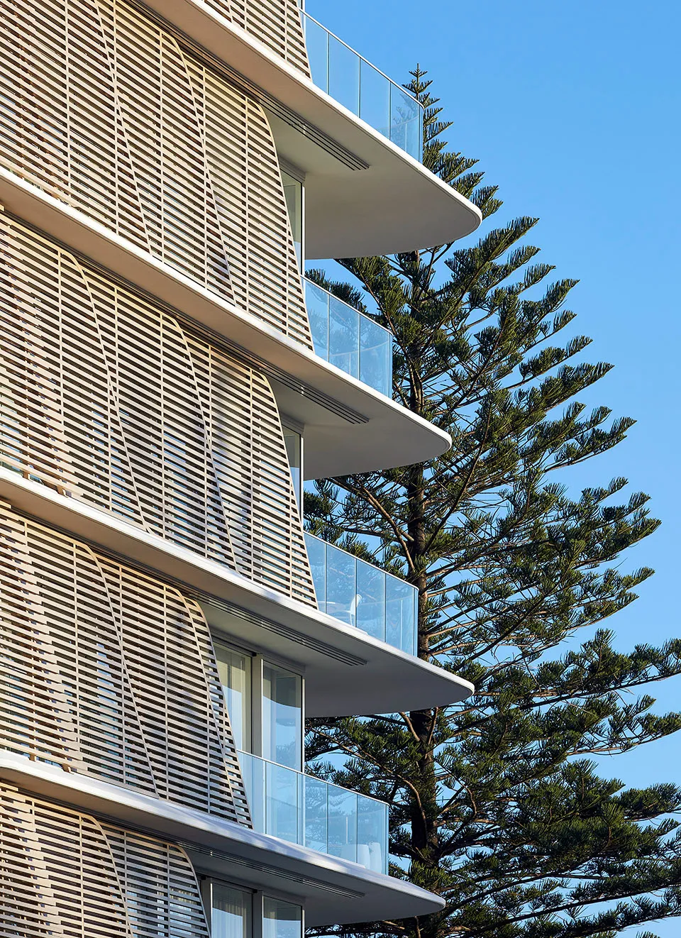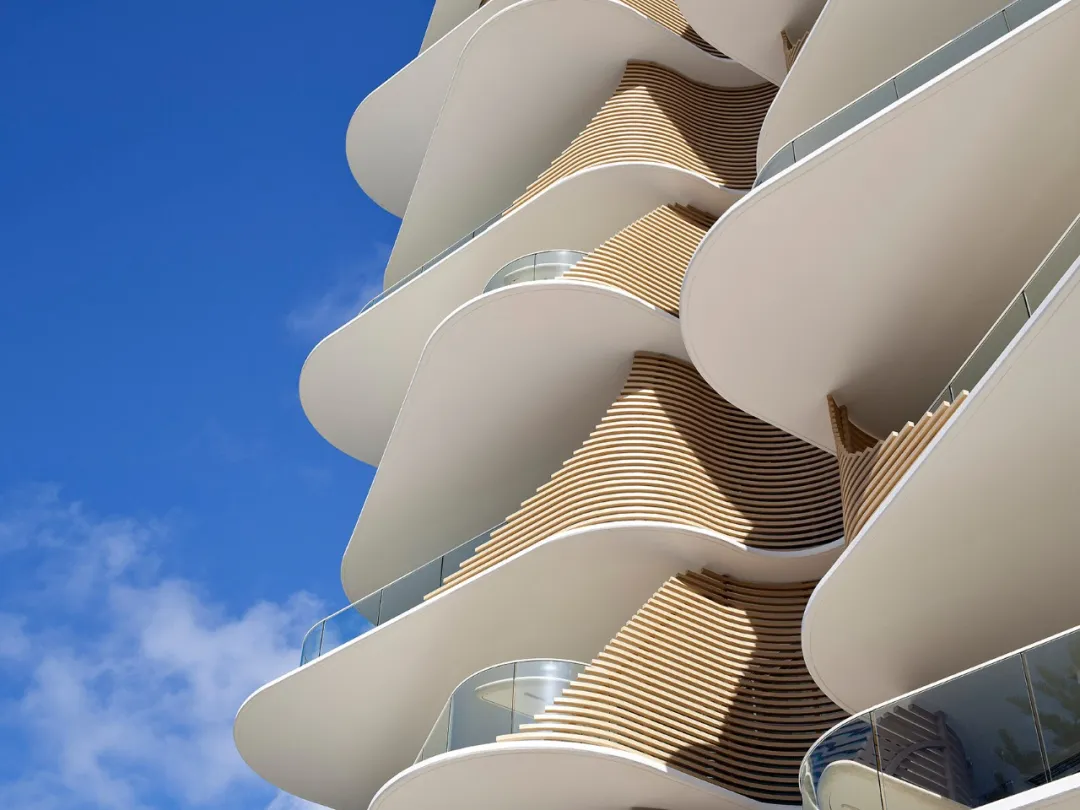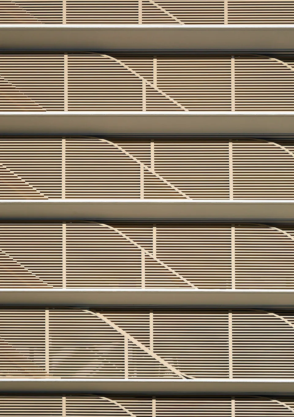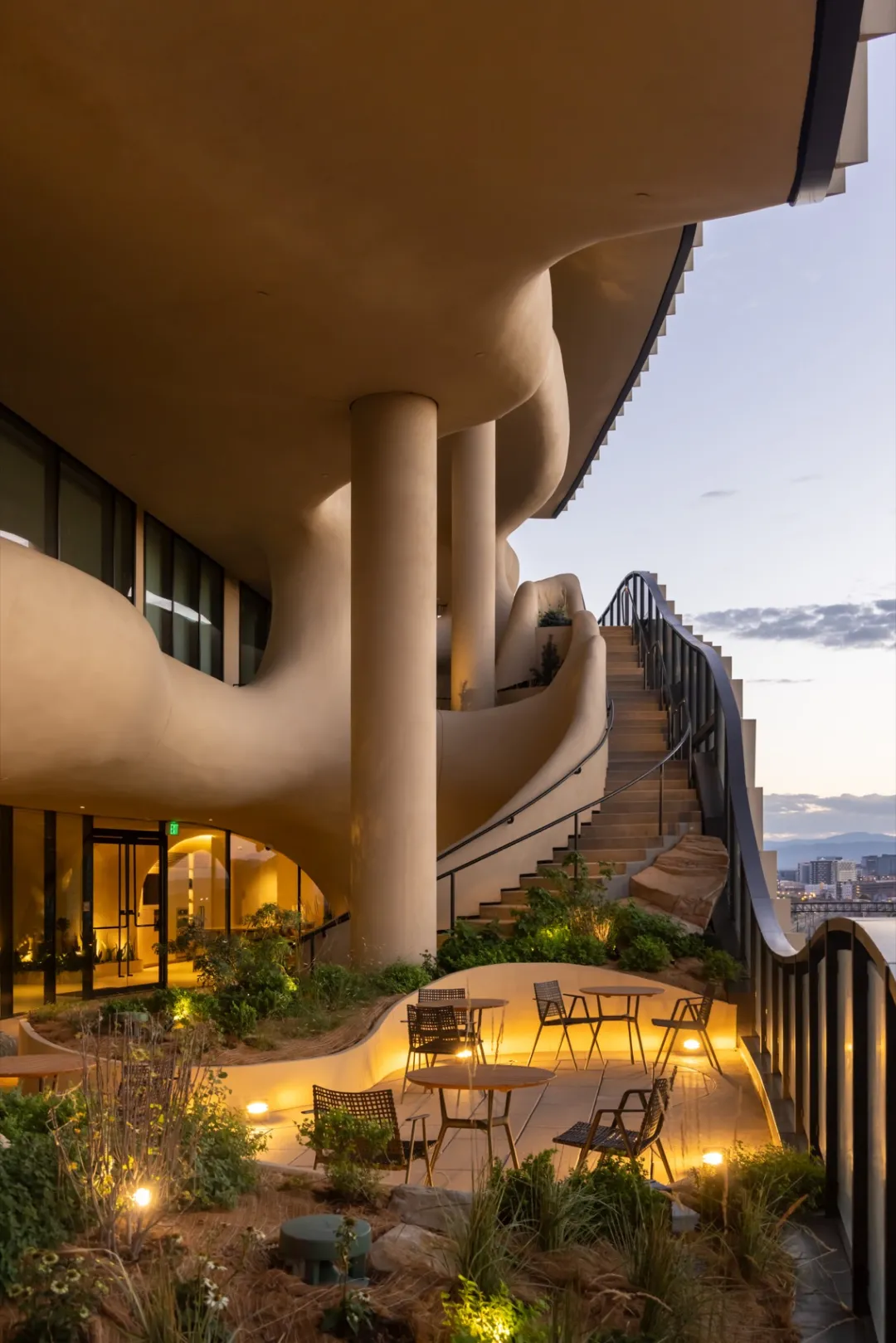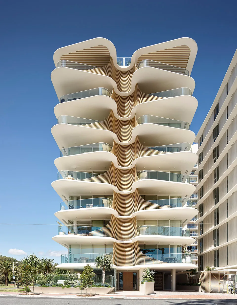 錐形的樓板邊緣從玻璃扶手處伸出,曲線的陽臺則可反射陽光,照亮公寓內部。弧線形的水平木條成為了這棟雕塑般建筑的脊梁,進一步突顯了設計的有機形態。