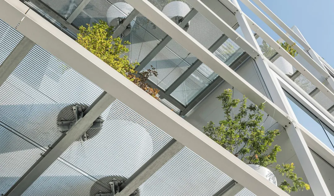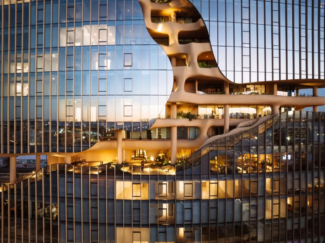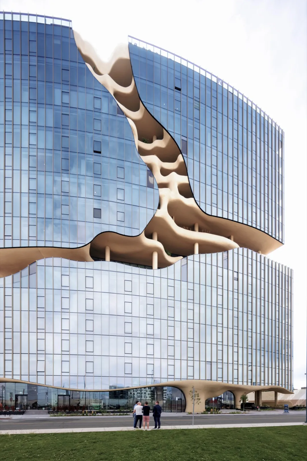 從外觀上看,如幕簾般拉開的垂直元素分布在建筑的多個立面,從中可以瞥見于大樓基座、核心區域以及屋頂上盛放的綠洲。