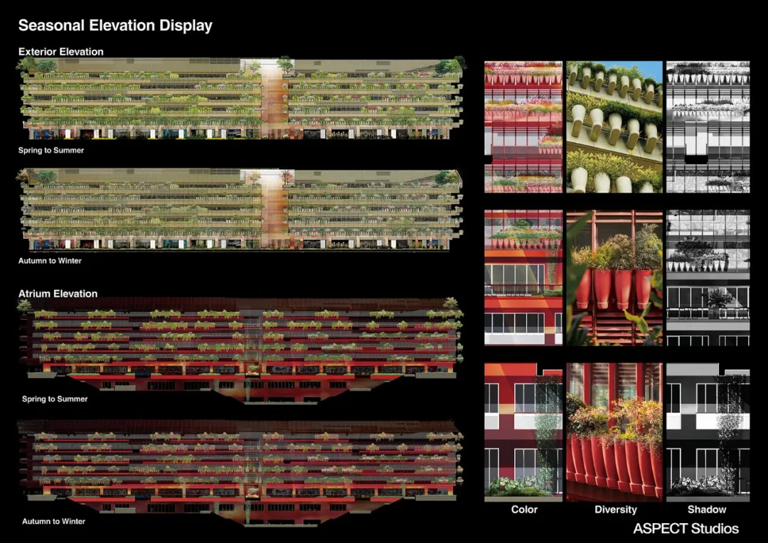 項目的精髓是其大膽的建筑和獨特的建筑生態立面,空中平臺和空中花園,與隨處可見的景觀植物花缽的巧妙結合。