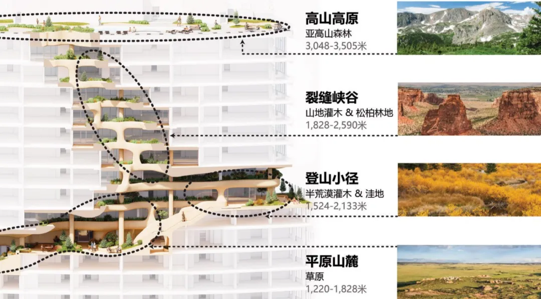 “垂直峽谷”將科羅拉多州多元的自然地貌特征——峽谷、高山、森林、溪流瀑布等向城市延伸和滲透,見證了城市創新與城市自然碰撞的化學反應。