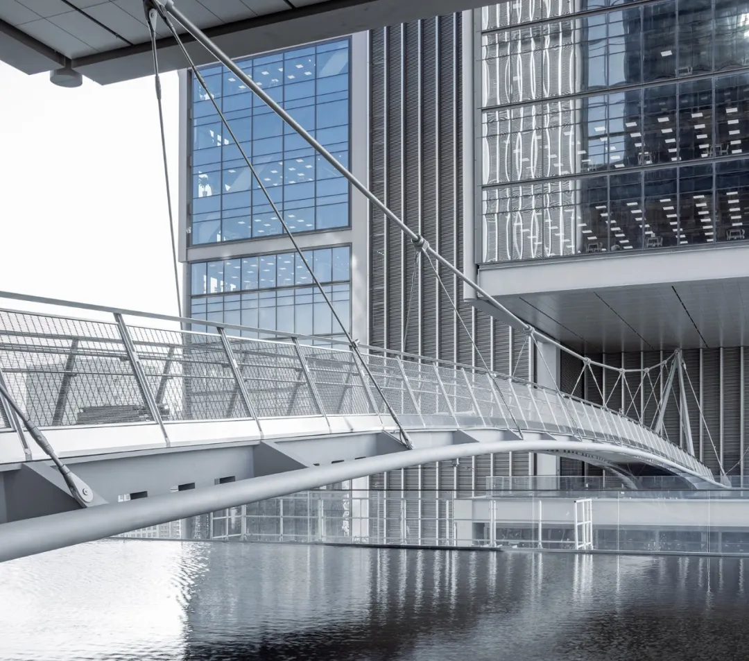 由東、西兩棟超高層塔樓組成,并由一座造型如羽毛般輕巧的鋼結構懸索橋相連接。