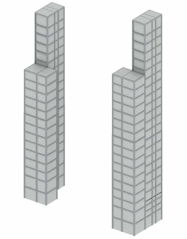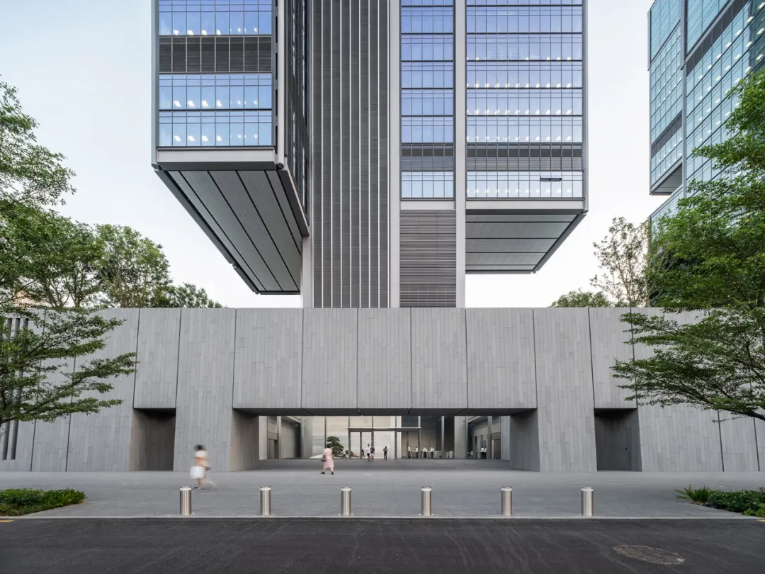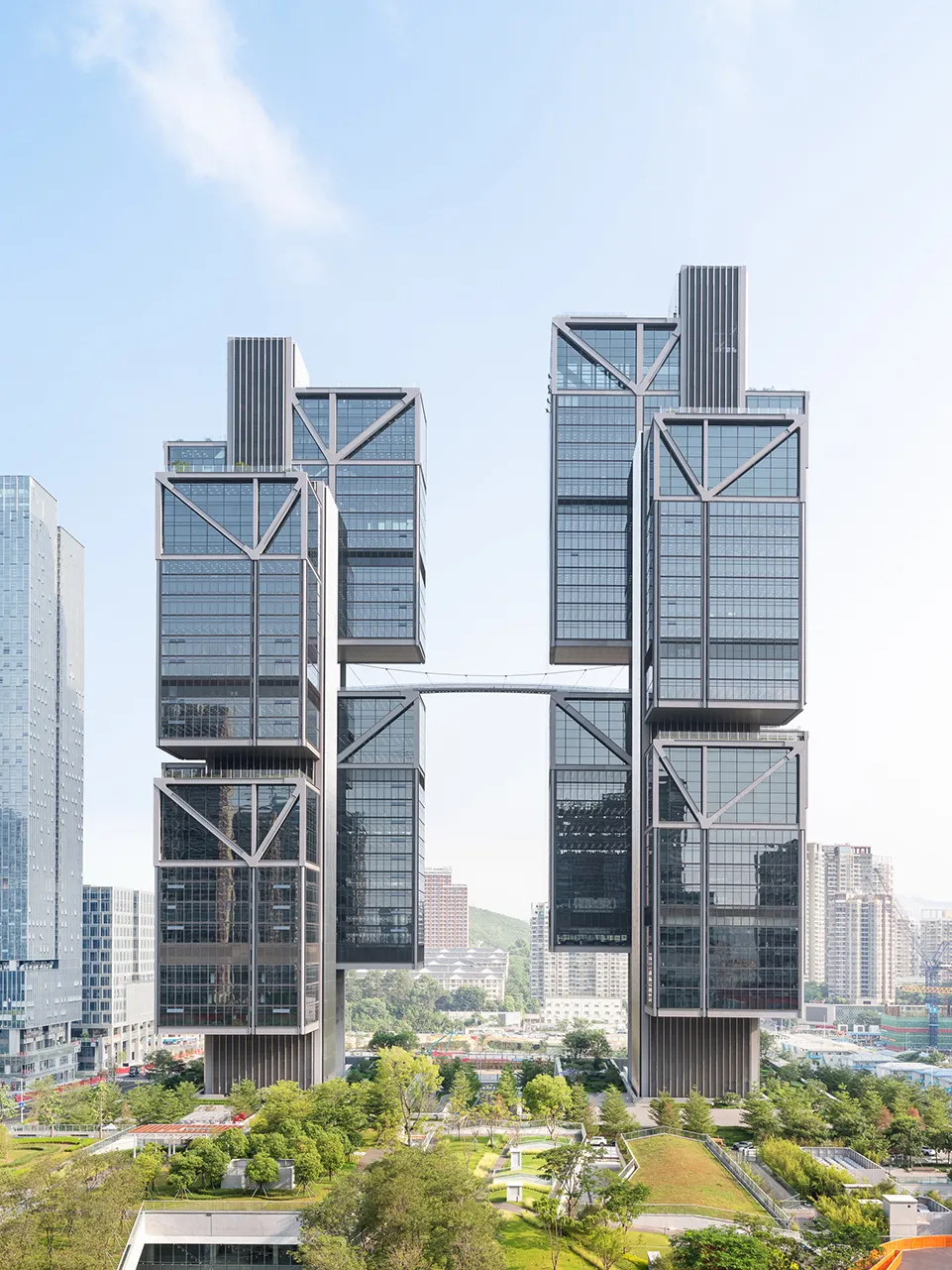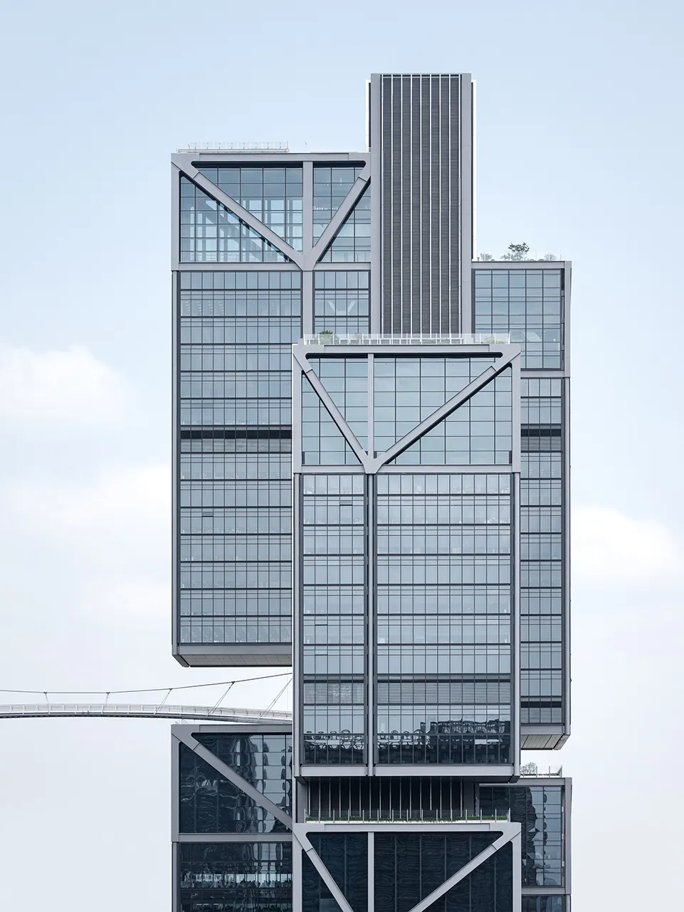 兩棟塔樓以兩顆大樹一般筆直挺拔的核心筒為核心,其它體量離地而起,東西各六個“玻璃體塊”箱體圍繞核心筒的三面不對稱懸掛,成就了獨特的“非對稱大懸挑”鋼結構體系。