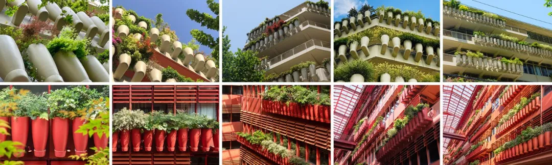鮮艷明快的紅磚與米黃色墻壁構成的線性矮窄巷道。隨處可見的綠植盆栽蔓延繁茂生長在建筑表皮、角落、入口、陽臺和窗臺上,共同孕育出人與綠植、肆意共生的氛圍。