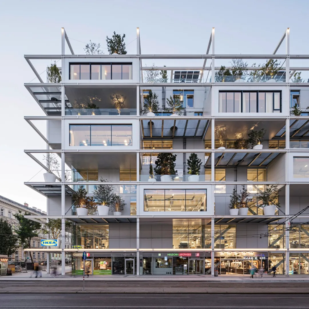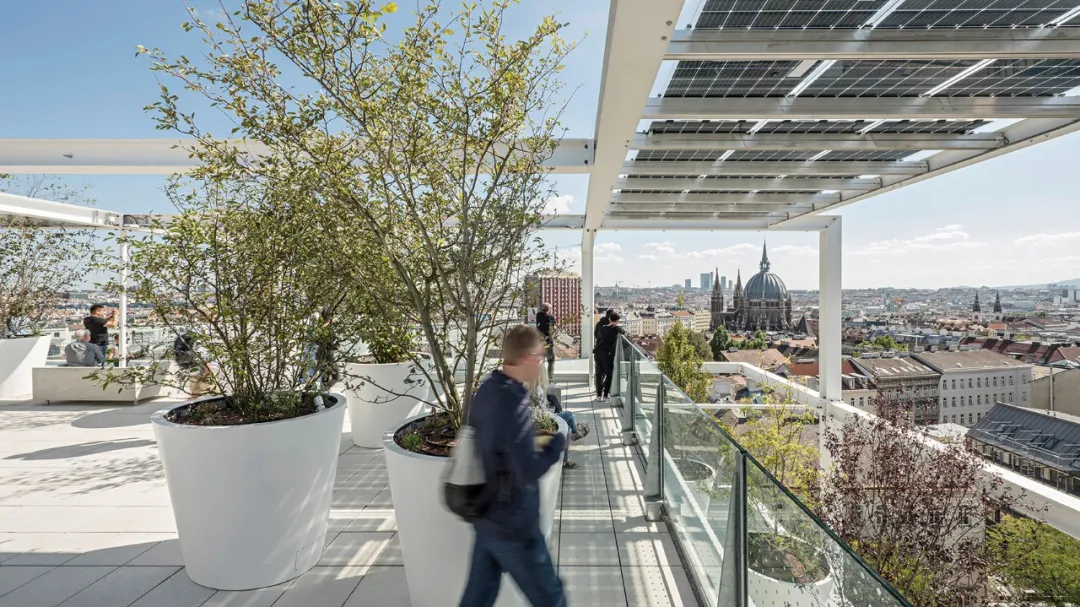 屋頂露臺向公眾開放,提供喝咖啡、放松身心和欣賞城市景觀的場所,立面裝點的大量綠色植物也是使建筑成為“好鄰居”的重要因素。