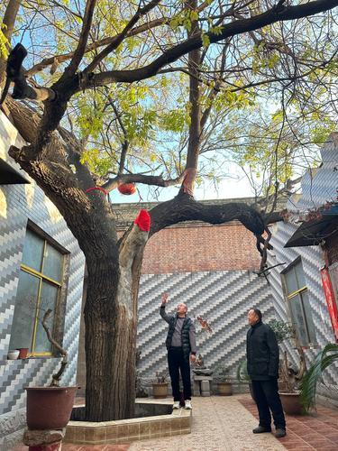 國槐是焦作市的“市樹”。由于是鄉(xiāng)土樹種,容易成活,它也是焦作市古樹名木名錄中數(shù)量最多的樹種,占比超45%。然而,你見過樹齡530年左右,從明朝中期至今,一個家族20代人接力守護的一棵老國槐嗎?這棵老國槐生長在馬村區(qū)馬村街道靳作村趙保安家的院子里。初冬時節(jié),老國槐葉落大半,洗去鉛華之后更顯滄桑。12月16日,趙保安和兒子趙新生講述了這棵老國槐的傳奇故事。