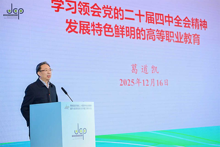 2025年12月16-17日,全國高等職業學校校長聯席會議在四川成都圍繞“新起點、新使命、新生態——開啟職教高質量發展新階段,譜寫教育強國建設新篇章”召開“貫徹落實黨的二十屆四中全會精神,提升高職院校辦學能力”研討會。中國高等教育學會副會長葛道凱作主旨報告。四川省教育廳二級巡視員陸衛江、會議承辦單位成都工貿職業技術學院黨委書記王濤分別致辭。會議由全國高等職業學校校長聯席會議主席張慧波主持。