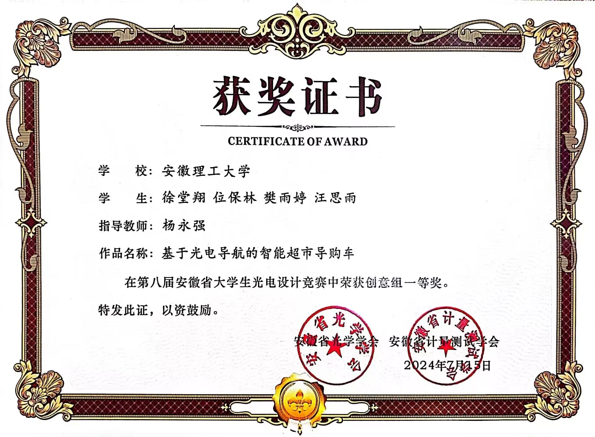 除了學習上的投入,徐堂翔注重豐富自己的大學經歷,他積極參加學科競賽,常常“身兼數職”在學習和競賽之間來回切換。大二下學期的時候,徐堂翔曾面臨兩門專業課同時期末考試,而此時他還是第八屆安徽省大學生光電設計競賽創意組《基于光電導航的智能超市導購車》項目的負責人。時間非常緊張,他既要保證專業課考試,又不能絲毫懈怠競賽的工作。“哪怕熬夜通宵,我也會把分內事做好。”尤其是為了完成比賽作品,團隊的所有同學擰成一股繩,敲定了“晝夜分工”的方案:白天聚力解決技術難題,推進代碼調試與實物制作;夜晚則熬夜復習,兼顧學業。最終這次競賽徐堂翔團隊成功斬獲了省級一等獎,他的兩門專業課成績也都在95分以上。而這種緊張的節奏實際上就是徐堂翔大學生涯的一個生動縮影。