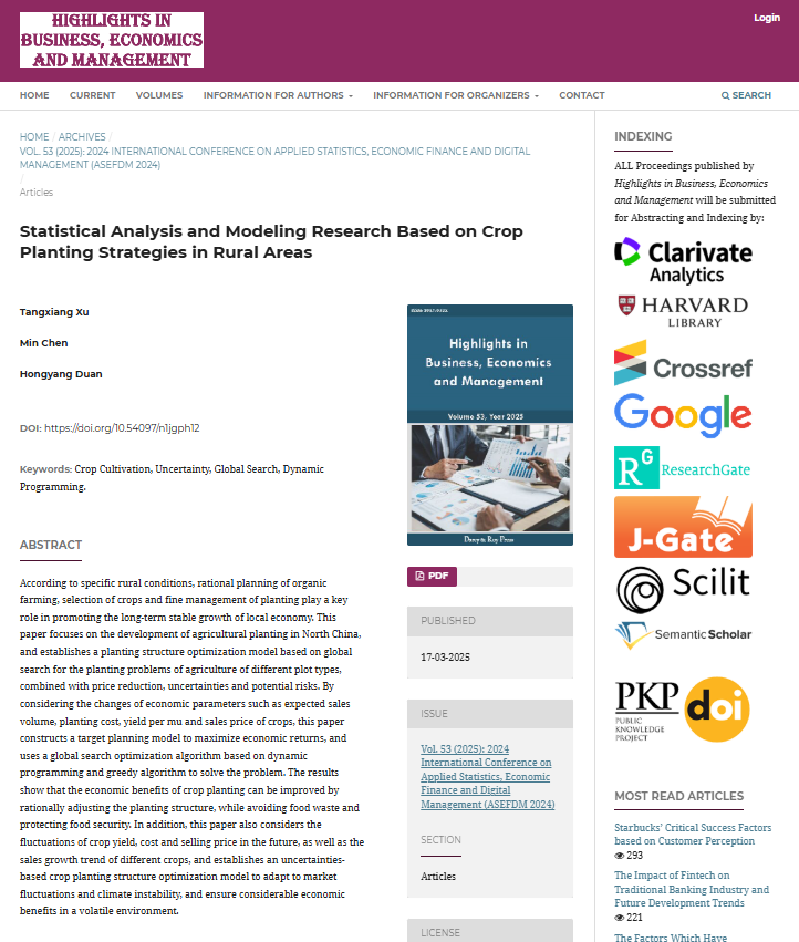 徐堂翔分別在2023年9月和2024年9月投入的科研項目分別是陳海平老師的《基于Raman活性聲子的拉曼散射研究分層AgCrSe2中的形狀研究》項目和王昕楊老師的《中子星內部物質狀態方程的研究》項目。陳海平的本項目研究層狀 AgCrSe2的拉曼散射特性,聚焦其晶格動態和電子-聲子相互作用。徐堂翔的主要工作是對實驗數據進行分析和擬合;繪圖程序的編寫;參與撰寫論文等。作為首次接觸科研項目的新人,徐堂翔更多的時候是一種“跟班學習”的狀態,從英文文獻的查詢閱讀到實驗繪圖的細節,徐堂翔逐漸窺探到科研工作的基本面貌,也得到了系統的訓練。他參與發表的一篇SCI論文《The Raman scattering investigation of a Raman-active phonon with Fanoline shape in the layered AgCrSe2》。而熟悉了科研基本工作的徐堂翔迅速行動起來,以第一作者身份發表CPCI論文《Planting Strategies in Rural Areas Statistical Analysis and Modeling Research Based on Crop》。目前他和項目組成員正基于王昕楊老師的研究課題擬發表新的SCI論文。