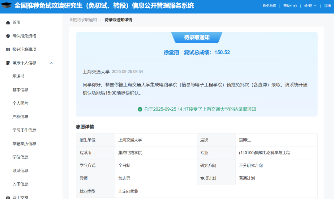 面試過程之中,徐堂翔也曾擔心過自己的狀態,他常常感受到政策變動下的無奈和競爭的殘酷,但好在自己在大學三年過程里早已磨礪出堅韌的性格,在自己的不懈努力下最終成功拿到了上海交通大學、浙江大學、東南大學和電子科技大學的推免offer。在9月25日確認接受上海交通大學集成電路科學與工程專業錄取的那一刻,他懸了三個月的心才終于落下。他坦言,整個過程是“一分快樂,九分痛苦,十分焦慮”,但最終的結果,是對他三年來所有努力和堅持的最好回報。選擇上交大,是因為他渴望更大的挑戰、更廣闊的平臺和國際化的視野,希望在上海這片熱土上“突破上限”,闖出自己的一片天地。