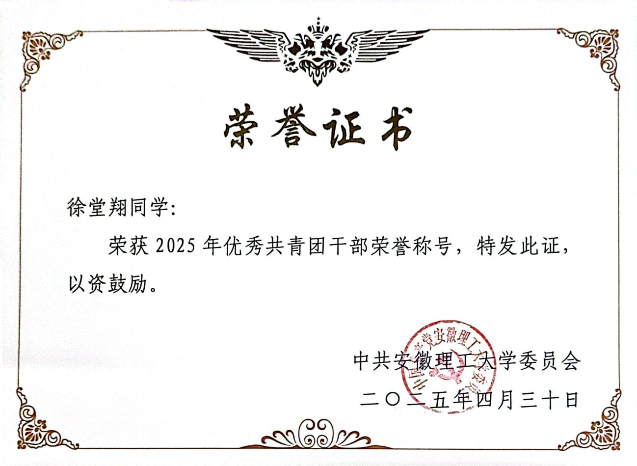 徐堂翔,中共黨員,安徽理工大學力學與光電物理學院光電信息科學與工程專業2022級學生,曾入選安徽省團省委首批“青年科學家培育支持計劃”(全校僅3人)、孫越崎能源科學技術“優秀學生獎”“校園十佳青年”提名候選人,兩次獲得國家獎學金,并榮獲三好學生標兵(1%)、優秀共青團干部等稱號。曾擔任院學生會主席、專業本科生黨支部紀檢委員、新生輔導員助理、班級心理委員等職務。目前,他已直博上海交通大學集成電路科學與工程專業。本科期間,徐堂翔成績卓越,連續三年保持專業第一(前1%),并在《電路分析基礎》(100)、《模擬電子技術》(96)、《數字電子技術》(93)等專業課程均取得了90+的成績,績點高達4.39!此外,他還積極參與各類賽事活動并有著豐富的科研經歷。徐堂翔曾榮獲“中國國際大學生創新大賽(2025)國家級銀獎”、“第八屆安徽省大學生光電設計競賽省級一等獎”“第十屆大學生物理實驗競賽國家級二等獎”等諸多獎項;他已發表SCI、CPCI論文各一篇、自主撰寫實用性新型專利三項、擁有五項軟件著作權。