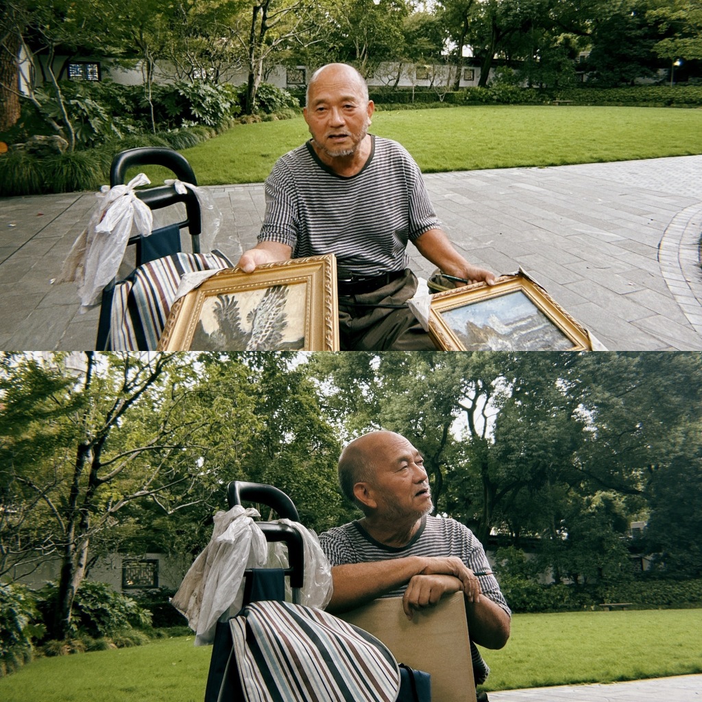 那兩張照片是我在上海桂林公園拍的,那天我沒帶相機,用手機拍了兩張。這位老者正在向我展示他的畫作,他對自己的創作非常有信心。我拍這張照片是因為,我發現上海有很多藝術家,他們有的盡管并非名家,但你能看到他的驕傲和熱愛。
