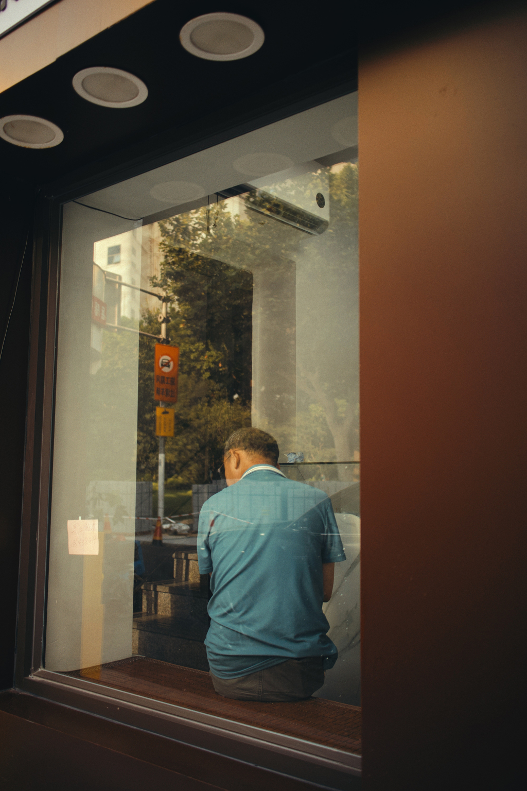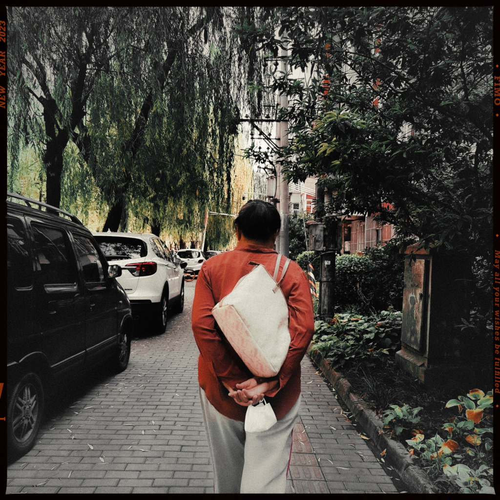 有一天,我走在路上,看到一位女士從遠處走來,她身上有些吸引我的狀態,我立刻拍下了這張照片。她看起來很專注。我回去用電腦編輯了一下,她在樹下走的樣子讓我感到一陣電影感。