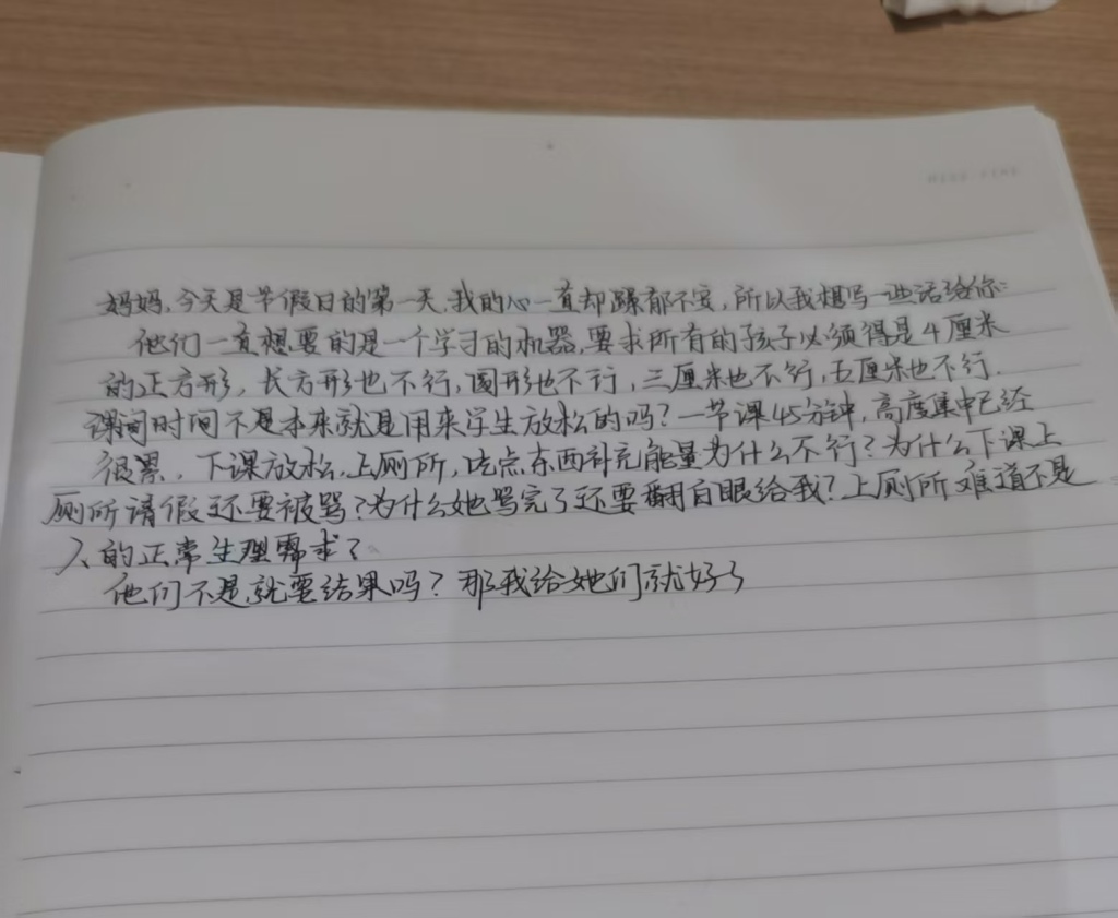 “媽媽,今天是節假日的第一天,我的心一直躁郁不安,所以我想寫一些話給你:他們一直想要的是一個學習的機器,要求所有的孩子必須得是4厘米的正方形,長方形也不行,圓形也不行,三厘米也不行,五厘米也不行。課間時間不是本來就用來學生放松的嗎?一節課45分鐘,高度集中已經很累,下課放松,上廁所,吃點東西補充能量為什么不行?為什么下課上廁所請假還要被罵?為什么她罵完了還要翻白眼給我?上廁所難道不是人的正常生理需求?他們不是就要結果嗎?那我給他們就好了。”