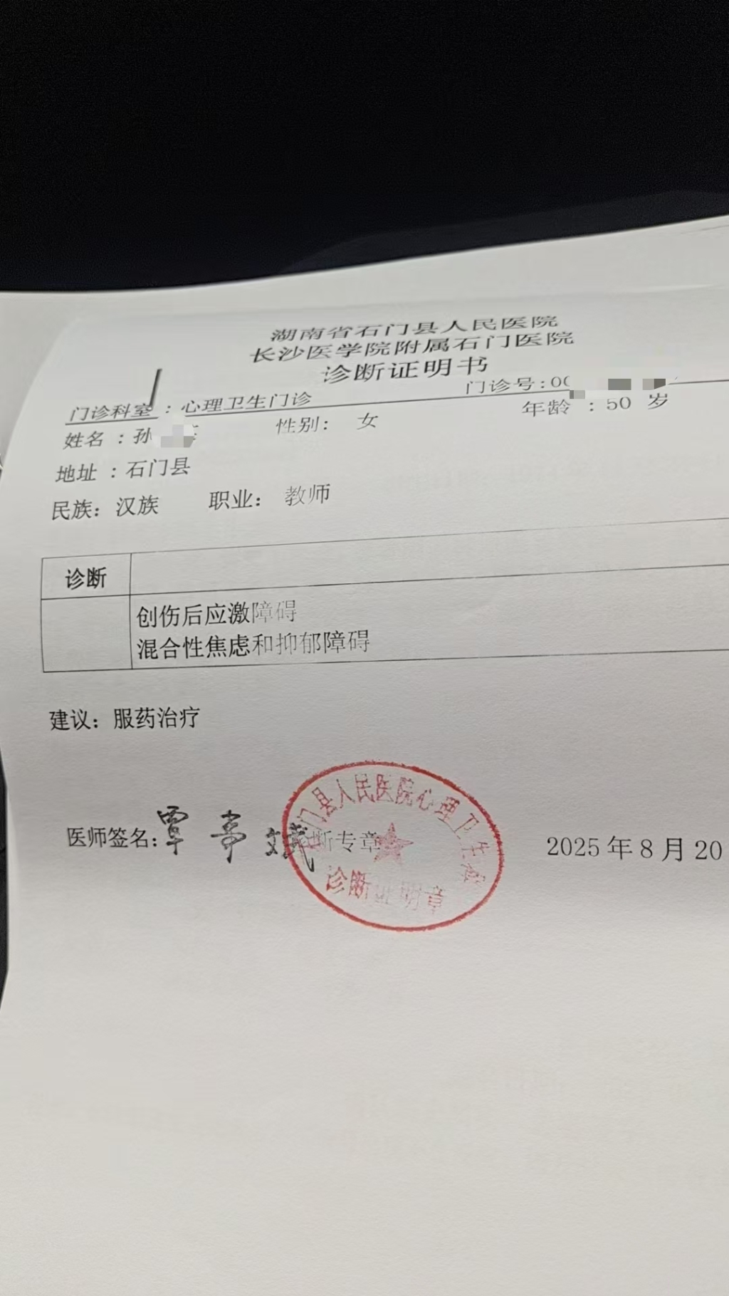 “現在整個二中只差一口氣發泄,搞得太難堪了。二中是全省非省級示范高中教育質量排名前五的學校。我們處理要極為慎重,不能有所偏頗。現在孫老師沒上講臺,在圖書館當管理員,而且經常請假。今年8月份,她遞交了一份‘創傷后應激障礙、混合性焦慮和抑郁障礙’的診斷。她從一個性格外向、年年優秀的老師,變得沉默寡言,狀況非常令人擔心。”石門縣教育局長李世輝說。