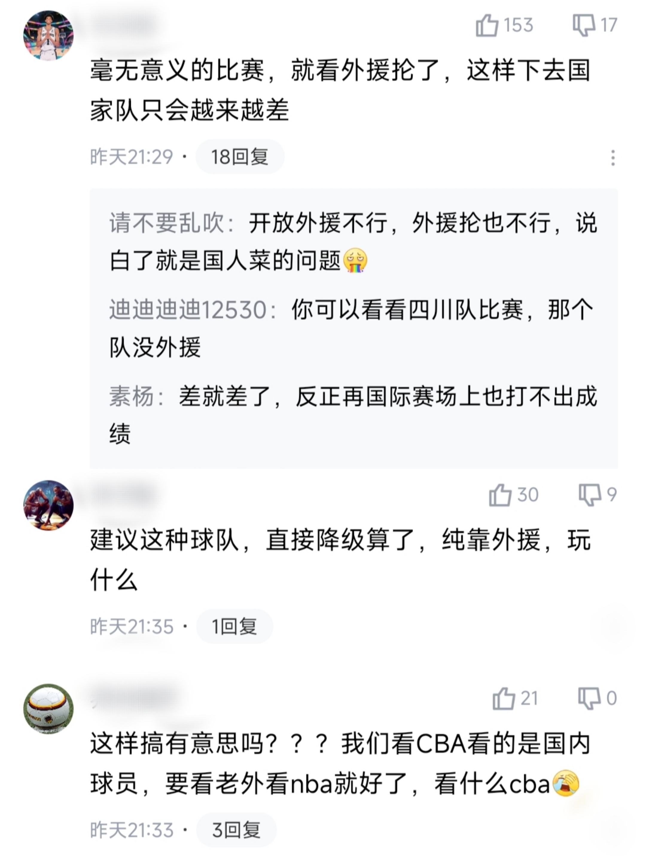 對于如此情況是引起熱議,部分球迷直言這就成為毫無意義的比賽,完全看著外援表演,國內的球員在進攻端幾乎無參與感,大部分時間都在跑動防守,偶爾得到機會也難以調動手感,對于他們來說沒有任何的鍛煉價值。