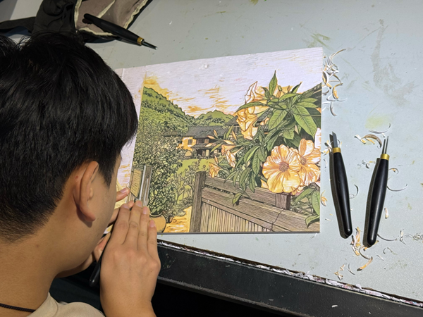 2025年10月22日,學(xué)生在那柯里絕版木刻工坊進(jìn)行版畫創(chuàng)作。新華社記者 邱星翔 攝