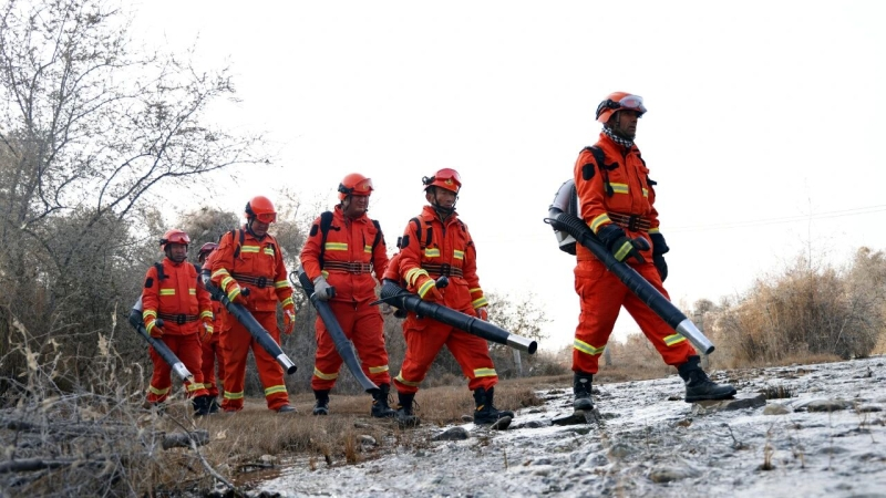 烏什縣奧特貝希鄉管護站消防應急分隊隊員身著防護服穿行在茫茫的林區,默默守護著這片綠色屏障。他們每天徒步10多公里,重點排查林區邊緣農戶野外用火、林區輸電線路隱患,并向周邊群眾宣講防火知識。
