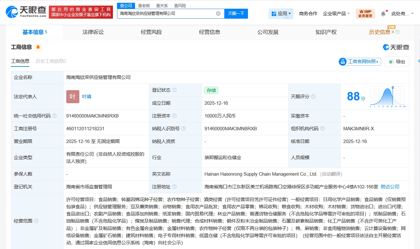 天眼查工商信息顯示,近日,海南海欣榮供應(yīng)鏈管理有限公司成立,法定代表人為葉禧,注冊資本1億人民幣,經(jīng)營范圍含食品銷售、轉(zhuǎn)基因棉花種子經(jīng)營、農(nóng)作物種子經(jīng)營、酒類經(jīng)營、日用化學(xué)產(chǎn)品銷售、食品銷售、谷物銷售、食用農(nóng)產(chǎn)品批發(fā)、食用農(nóng)產(chǎn)品零售、進(jìn)出口…
