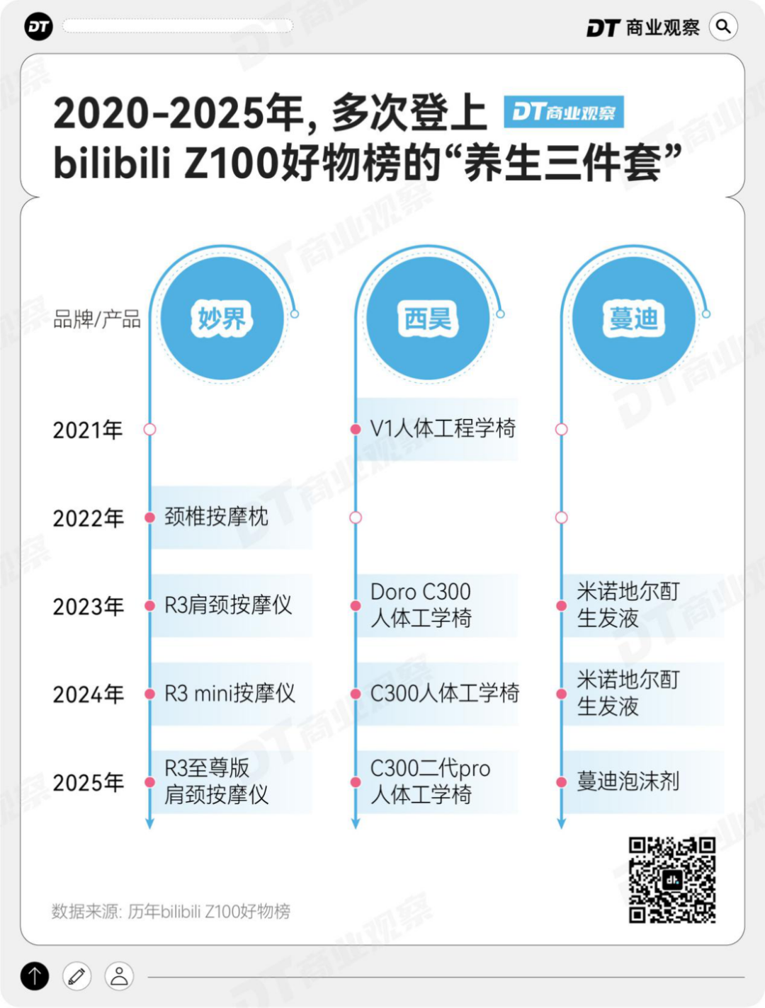 蔓迪米諾地爾酊生發液/生發泡沫、妙界肩頸按摩儀和西昊人體工學椅,都在2023-2025年連續三年上榜,而且在一次次迭代升級中,越來越貼合打工人的使用需求。