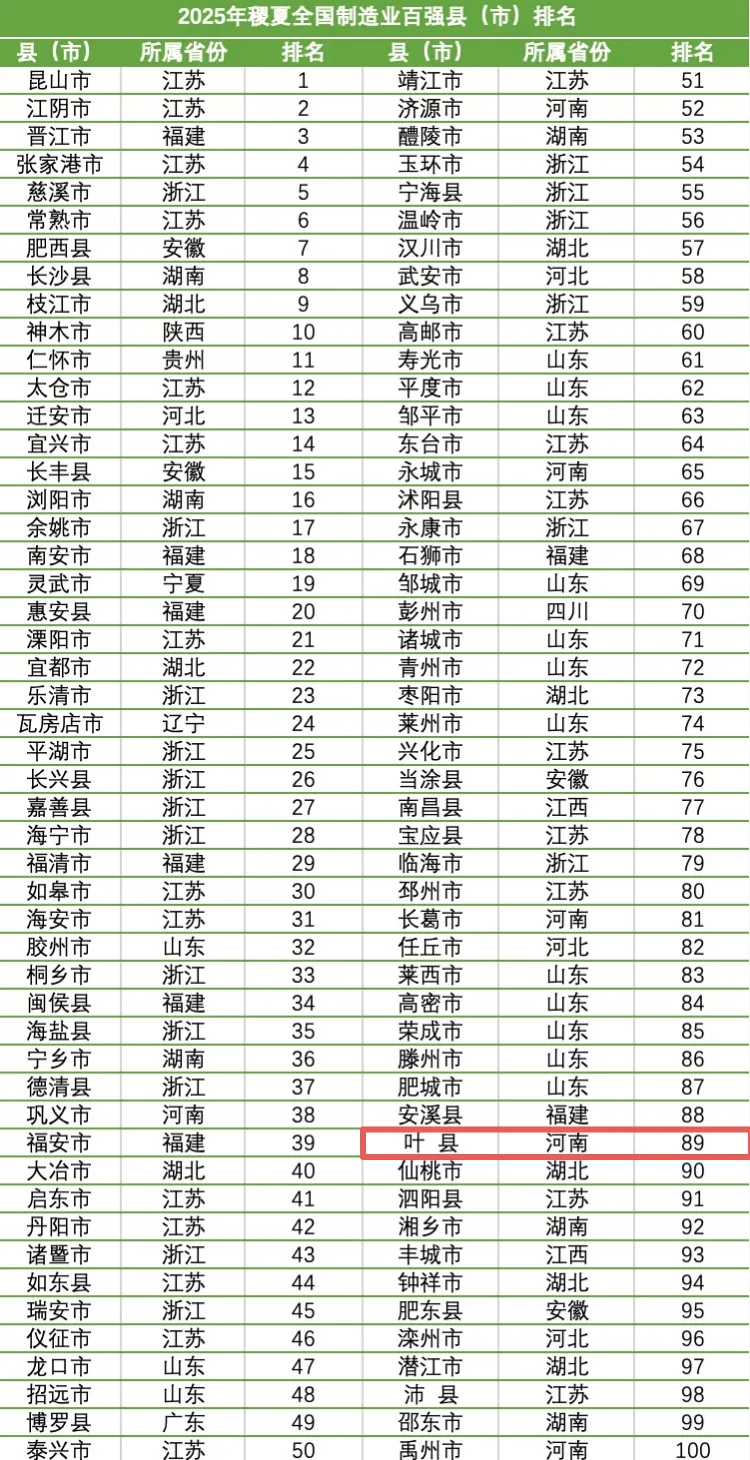 12月17日,2025年全國制造業百強縣(市)榜單發布,葉縣居第89位,較2024年上升2個位次。這是葉縣連續第四年上榜,持續穩固平頂山市唯一上榜縣(市)的地位。