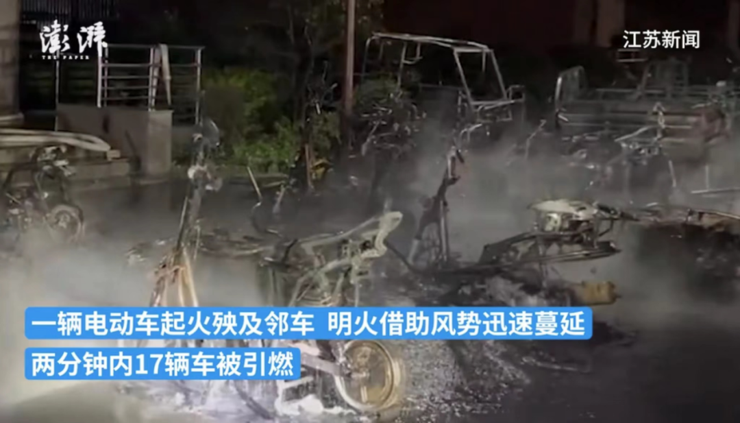 2023年3月16日,江蘇泰州,有市民在單元門口"飛線"充電,因線路故障引發火災。一輛電動車起火殃及鄰車,明火借助風勢迅速蔓延,兩分鐘內17輛車被引燃。
