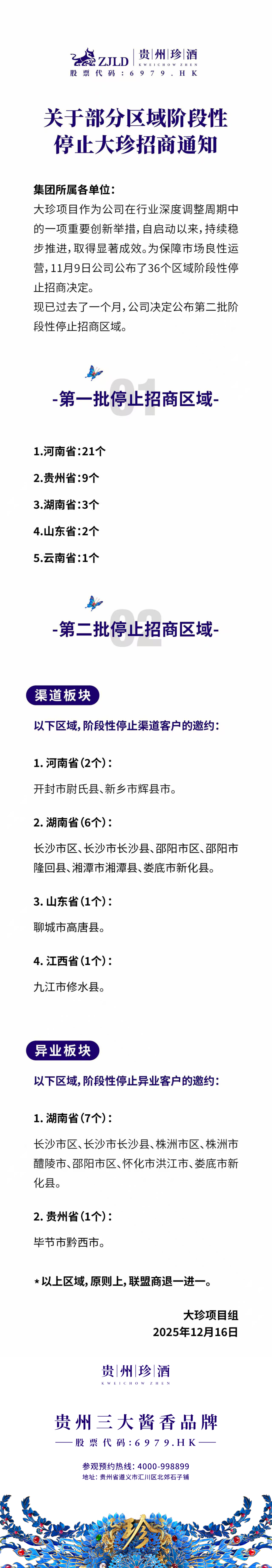 12月19日,貴州珍酒再次發布關于部分區域階段性停止大珍招商通知,此次共涉及5個省份,共15個縣市區。