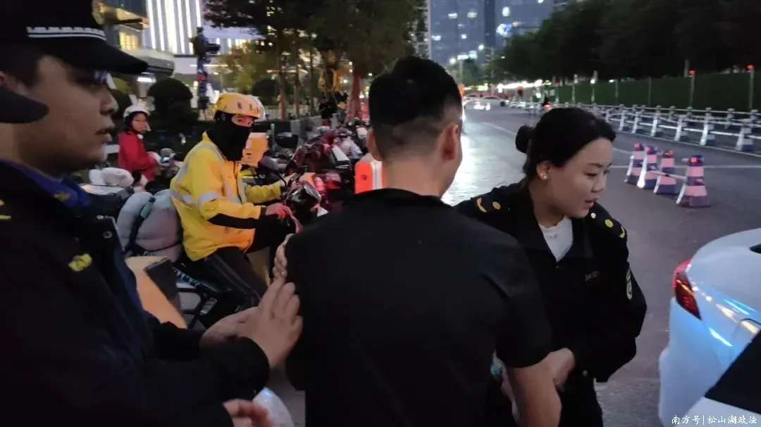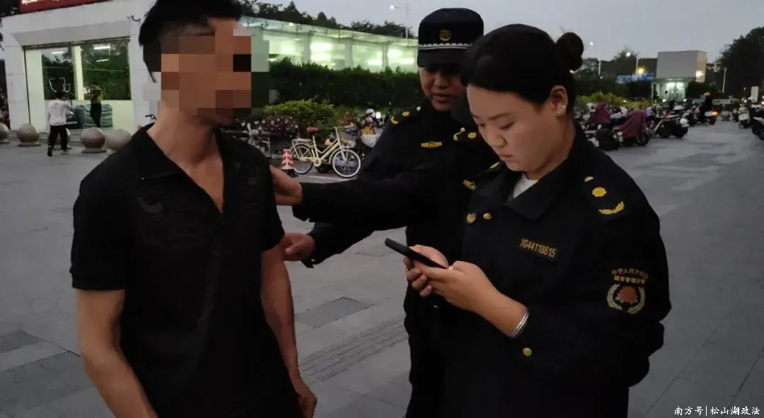 下午5點30分許,松山湖城管分局市容整治專班的5名城管隊員,在萬象匯商業區開展環境衛生巡查工作,當來到松山湖北站出入口的時候,發現一名中年男子站在路邊,眼神遲鈍,身體搖晃,而且雙手一直在顫抖,隨時可能暈倒。緊急時刻,城管隊員馬上沖過去扶住男子,耐心安撫情緒的同時詢問對方是否需要幫助。