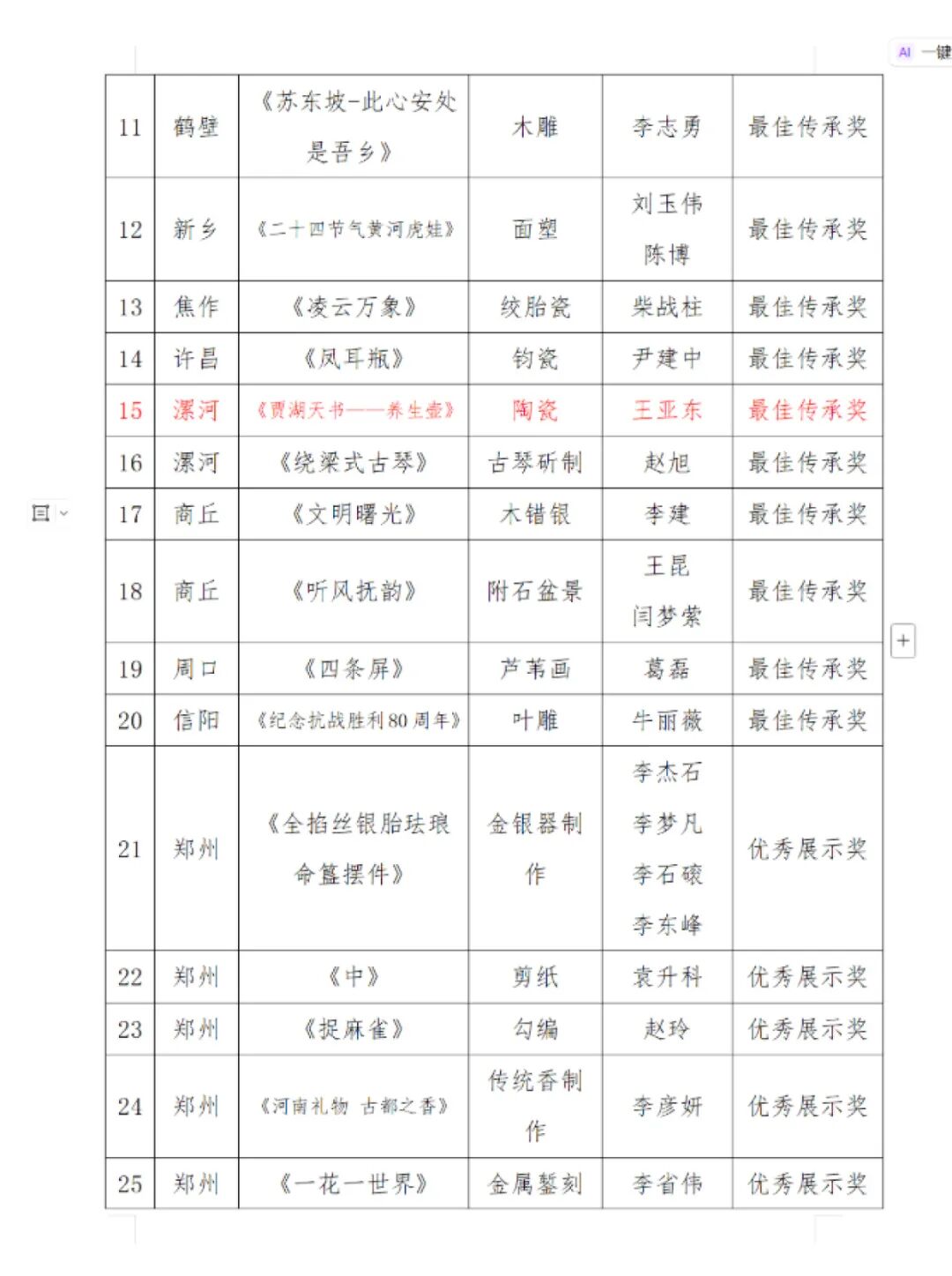 2025年12月10日,河南省文化和旅游廳公示“古藝心聲 匠心中原”第六屆河南民間藝術展評審結果,漯河市舞陽縣文化館選送的《賈湖天書養生壺》榮獲此次展覽最高獎——最佳傳承獎。