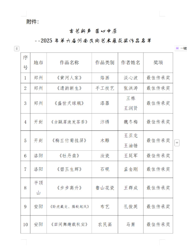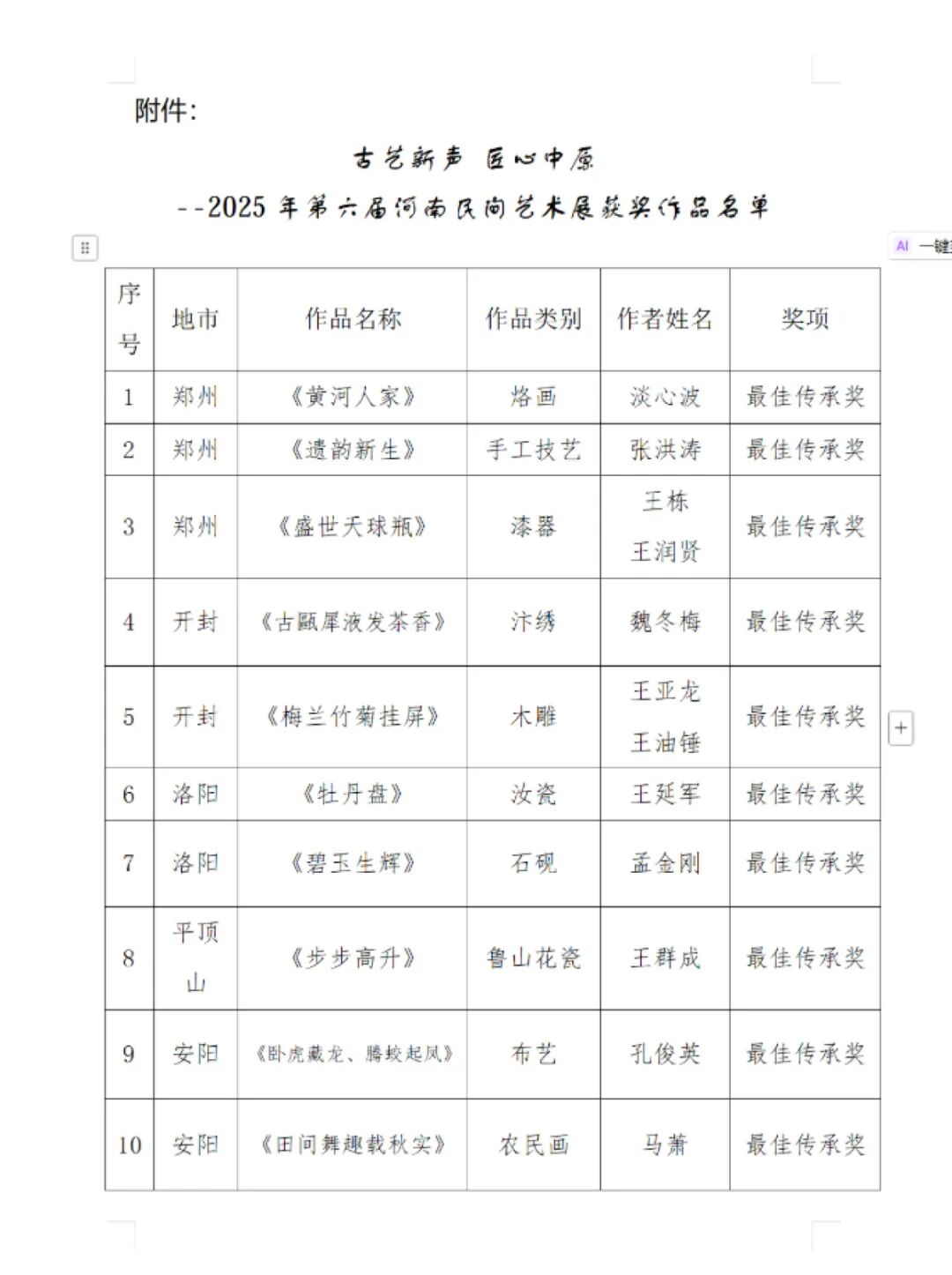 據悉,根據2025年河南惠民文化活動總體安排,由河南省文化館組織開展的第六屆河南民間藝術展作品征集工作,經全省縣、市各級推薦,共收到30類1500余件作品。經專家評審,最終評出最佳傳承獎20個、優秀獎40個、別具匠心獎60個、榮譽參展獎20個。