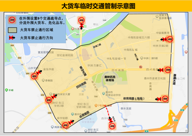 2.管制區域及措施:奧林匹克體育場周邊環湖二路、蓓惠路、演達大道、惠澳大道、體育南路合圍區域,禁止核載4.5噸以上貨車、危險化學品運輸車輛通行。(見圖1)