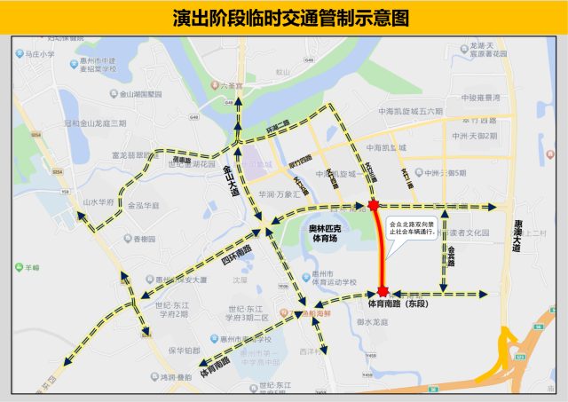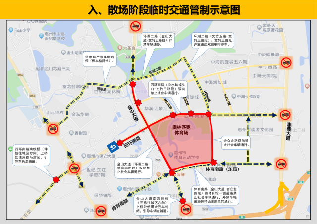 請前往惠州奧林匹克體育場的觀眾盡量選擇大巴車接駁出行,到就近的接駁點換乘大巴往返。請途經車輛提前規劃好行車線路,避開上述交通管制路段出行,以免交通擁堵。
