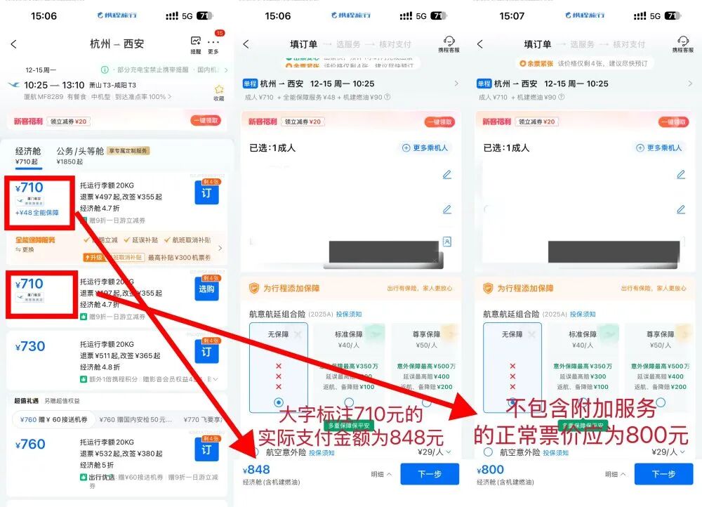 “我以為自己已經很小心了,所有需要打勾的我都沒選,沒想到最后還是‘踩坑’了。”說起不久前在攜程購買機票的經歷,來自上海的小劉仍顯憤懣。過去,默認勾選、捆綁銷售是部分線上旅游預訂平臺誘導消費者的主要手段。如今,這些套路升級變種,呈現“低價誘導用大字加粗,附加收費靠小字加注”的特點。“一坑接一坑,坑坑不一樣,坑坑躲不過”,不少消費者直呼上當。