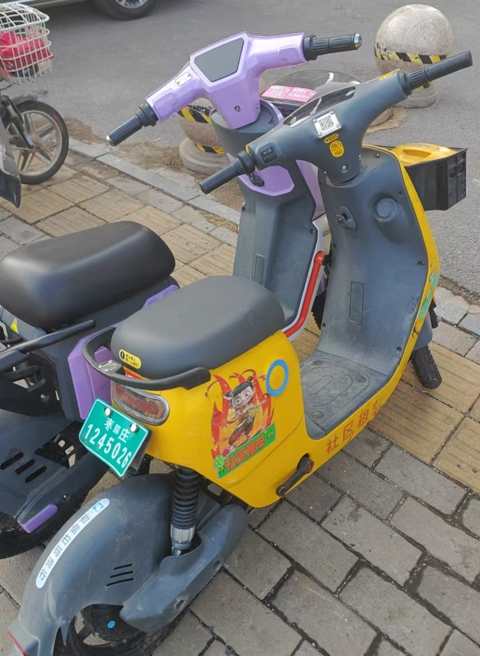 在印象濟(jì)南·泉世界周邊的小區(qū)附近同樣停放著幾輛租賃電動(dòng)自行車,車身顏色為紫色和黃色,車身分別印有“錦鋰租車”和“社區(qū)租車”的標(biāo)識(shí),車筐內(nèi)配備了頭盔,需掃碼進(jìn)入小程序解鎖騎行,印有“社區(qū)租車”的黃色電動(dòng)車懸掛棗莊號(hào)牌。