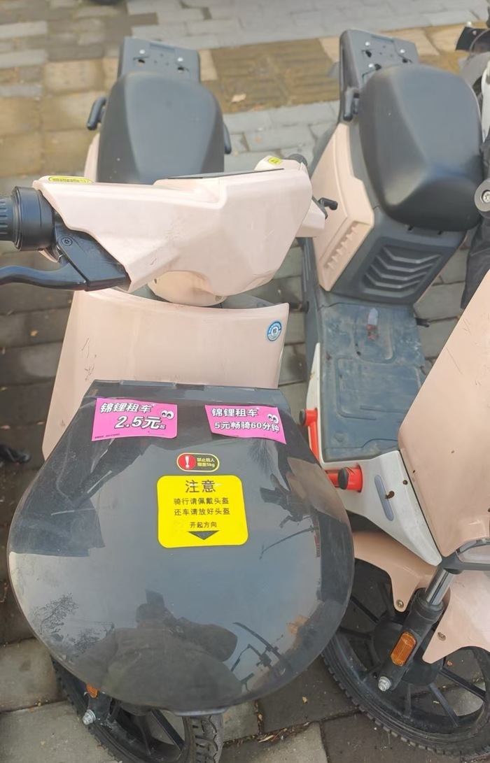 記者在濼源大街附近走訪發(fā)現(xiàn),幾輛黑白拼色的電動(dòng)車停放在輔道的車輛停放點(diǎn),黑色車筐上貼有“錦鋰租車”的字樣,標(biāo)有2.5元起、5元暢騎60分鐘廣告語(yǔ),車筐內(nèi)配備了電動(dòng)車頭盔,提醒用戶“騎車請(qǐng)佩戴頭盔,還車請(qǐng)放好頭盔”,車尾則懸掛著德州號(hào)牌。