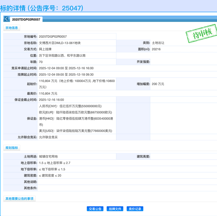 該地塊原定于12月15日上午競拍,因故掛牌截止時間調整為18日9點30分。地塊位于山東博物館以西,與今年6月出讓的單價“2萬元+”地塊相鄰,出讓面積20216平方米,地上容積率為2.7,總價110804萬元。由于本次只有一名競買人報價,最終該地塊以起始價成交。