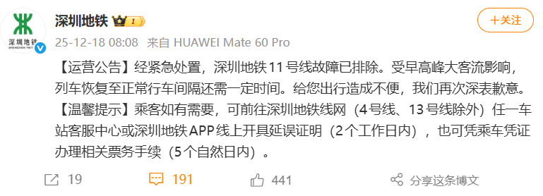 經緊急處置,深圳地鐵11號線故障已排除。受早高峰大客流影響,列車恢復至正常行車間隔還需一定時間。給您出行造成不便,我們再次深表歉意。