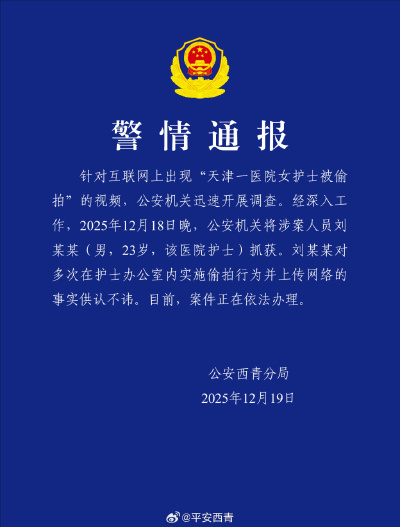 12月17日,有博主曝料稱天津某醫院護士站更衣室被裝攝像頭,偷拍護士更衣,提醒醫護人員要注意保護好自己的隱私,此事引發關注。