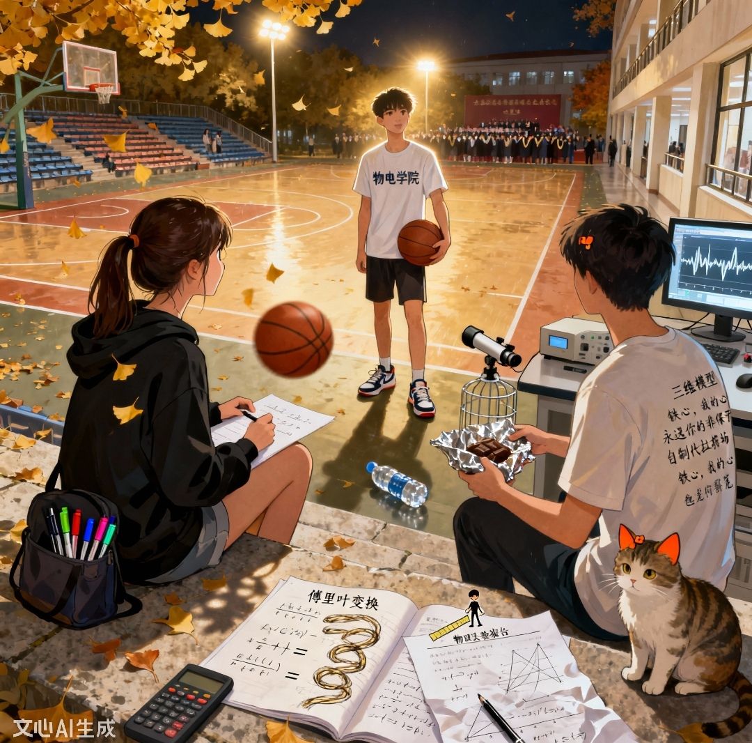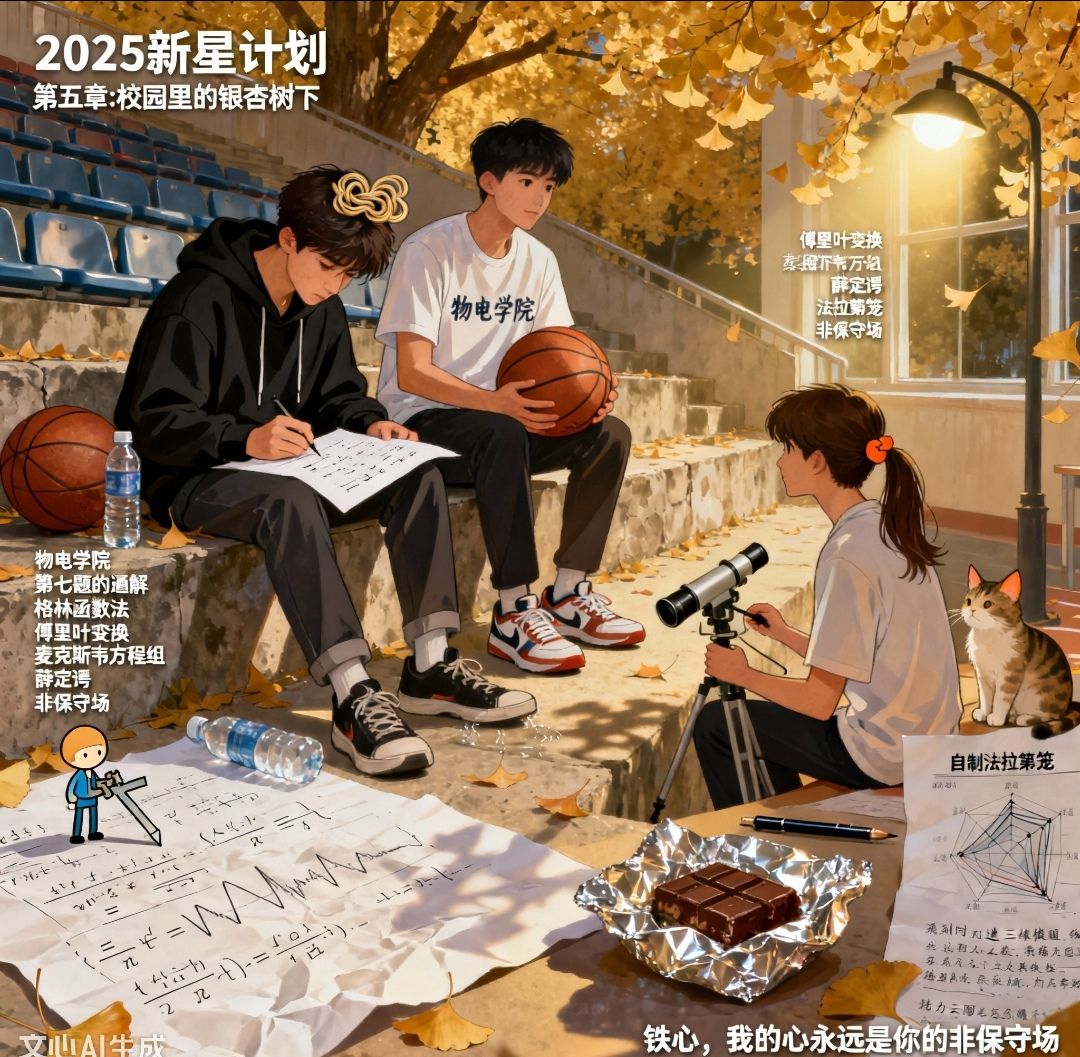 暮色四合,如一塊巨大的幕布,緩緩籠罩了整個世界。他們坐在籃球場邊的石階上,鐵心輕聲講解著傅里葉變換,銀杏葉似金色的蝴蝶,輕輕落在她馬尾辮上;魏一通則興致勃勃地聊起天文望遠鏡的色差問題,遠處路燈恰在這時點亮,將他睫毛的影子,投在公式密布的草稿紙上,宛如一幅神秘的畫卷。