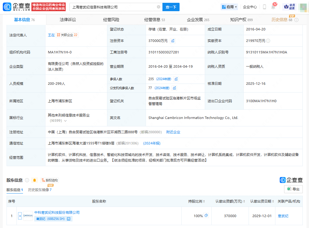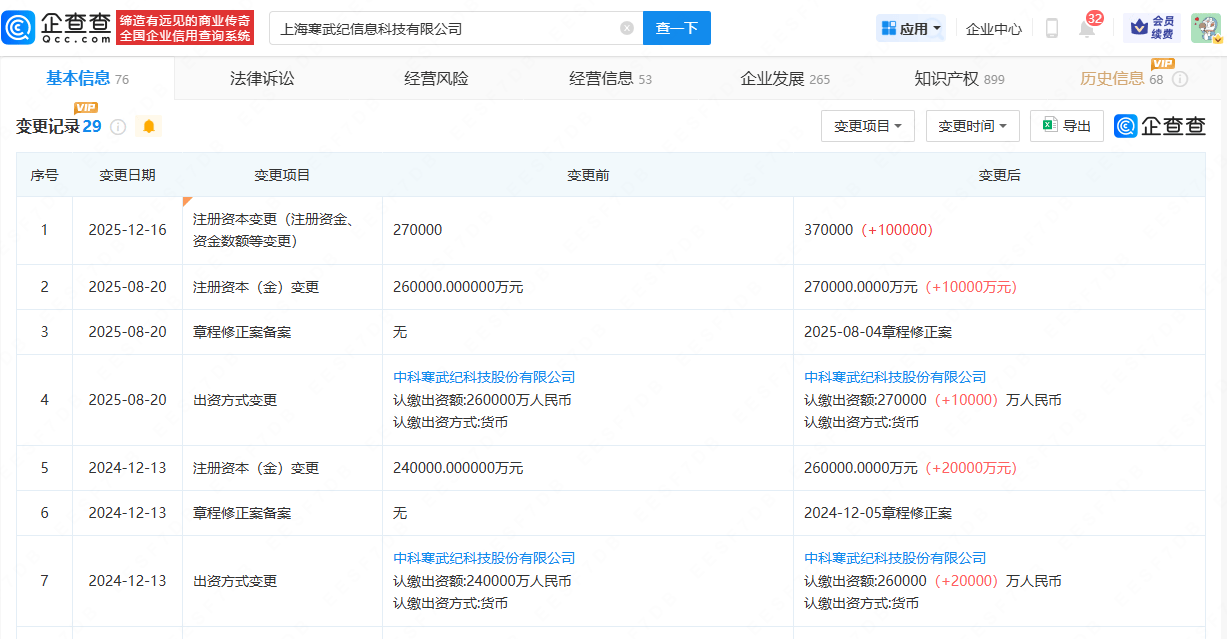 企查查APP顯示,近日,上海寒武紀信息科技有限公司發生工商變更,注冊資本由27億人民幣增至37億人民幣。企查查信息顯示,該公司成立于2016年4月,法定代表人為王在,經營范圍涉及計算機軟件、計算機科技、信息技術、智能化科技領域內的技術開發、技術咨詢、技術服務、技術轉讓等,由寒武紀(688256)全資持股。