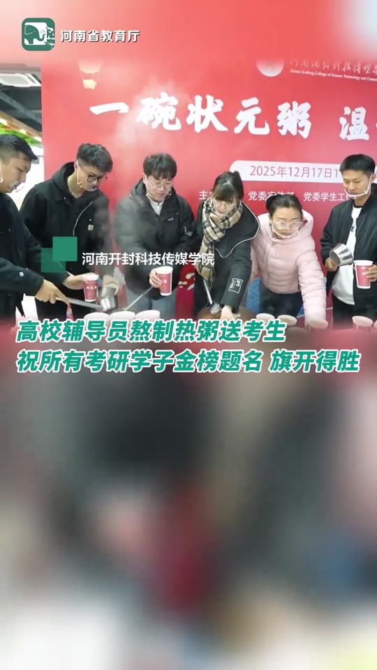 12月17日,河南開封科技傳媒學院舉辦“狀元粥到”考研助力活動,輔導員們親手熬制并為學生盛上熱騰騰的狀元粥,以暖心行動傳遞“一戰成碩”的美好祝福。